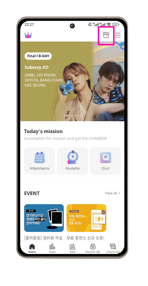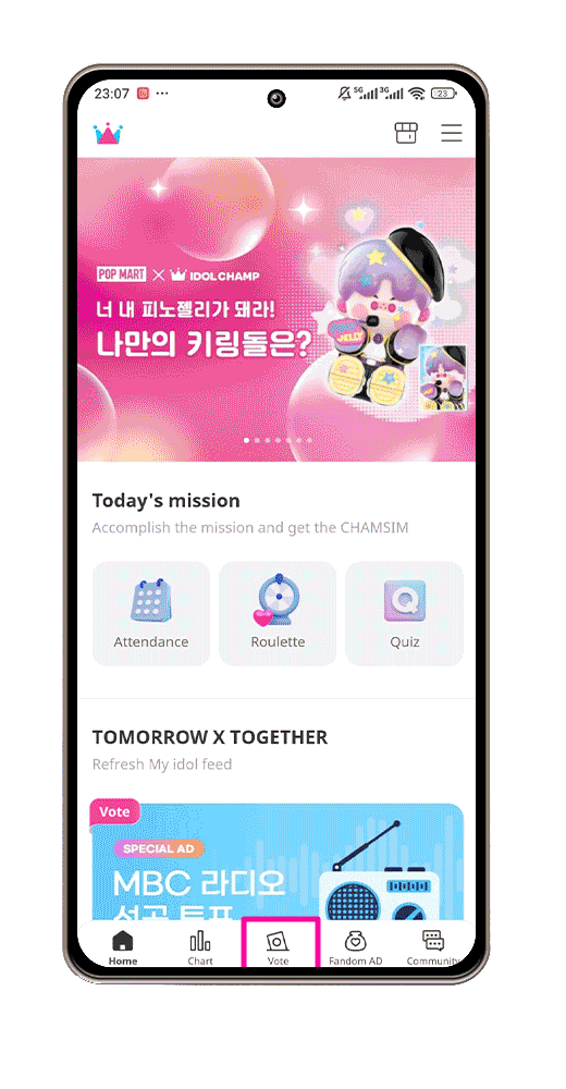 Na tela inicial do aplicativo do Idol Champ, vá para a aba de votação (Vote).