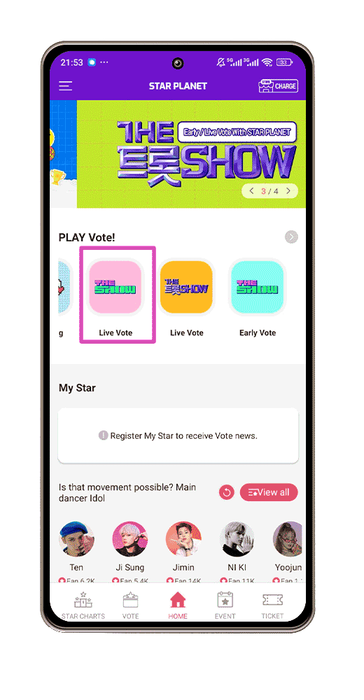Na tela inicial do aplicativo da Starplanet, procure pelas votações "Live Vote - The Show" e "Early Vote - The Show".Early Vote/ Pré-Votação:
